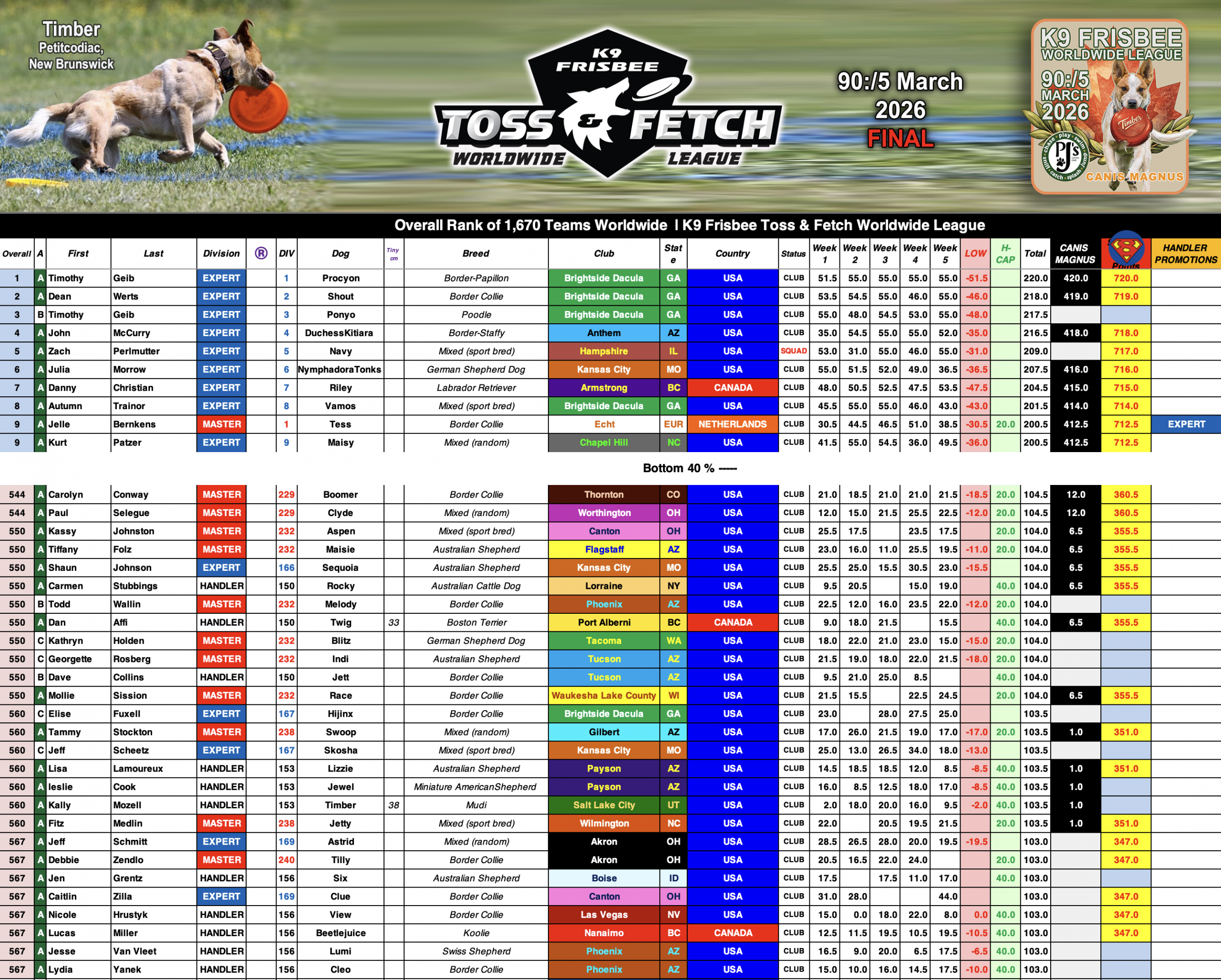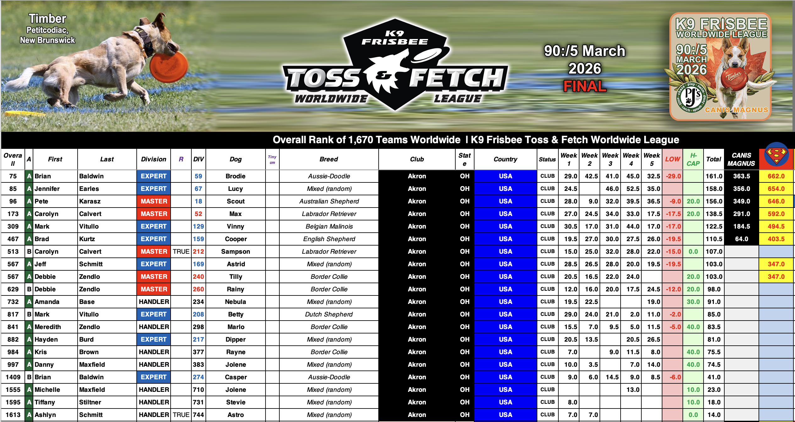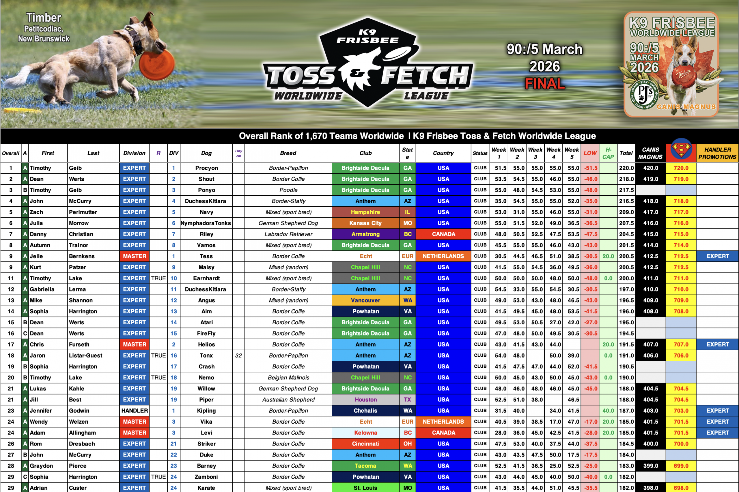 Here are the top 30 of the 1,670 Teams who played in the 90:/5 March 2026 Season of the K9 Frisbee Worldwide League.